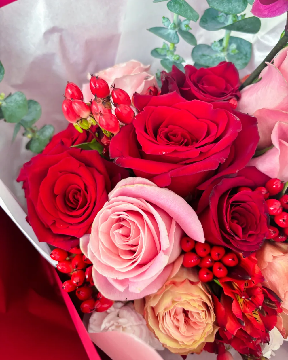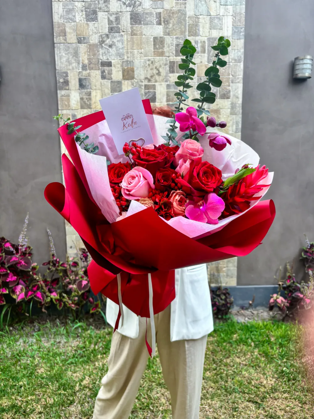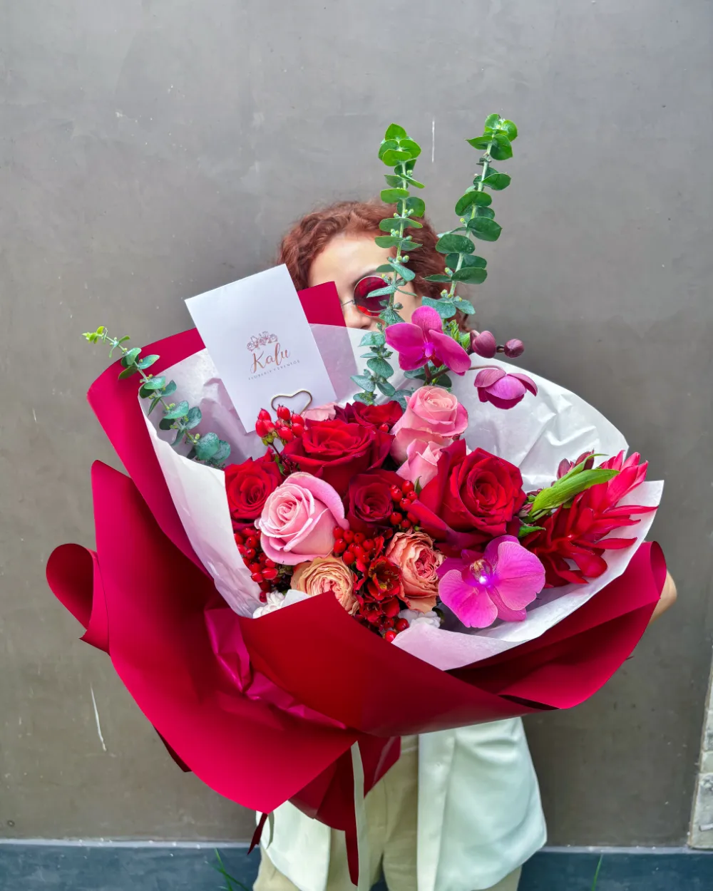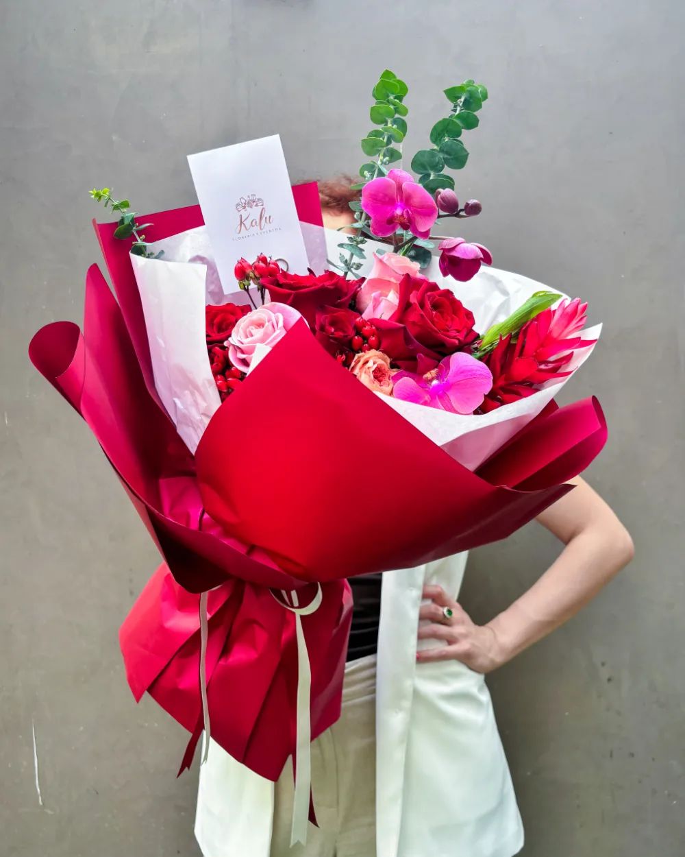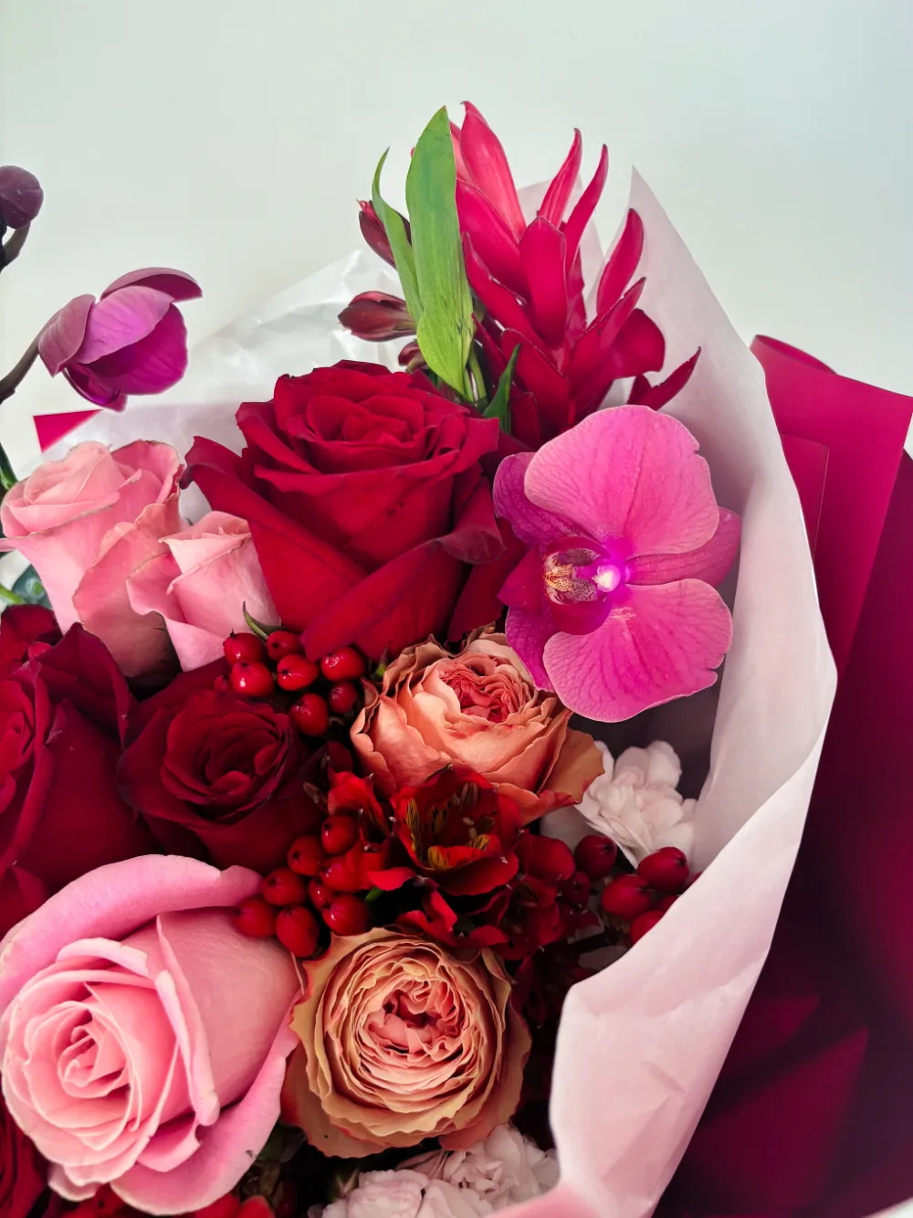Pasión que Florece combina rosas rojas, mini rosas rosadas, orquídeas y follaje oscuro en una composición poderosa y envolvente. Cada elemento expresa amor, admiración y entrega. Envuelto en tonos borgoña, este ramo es una declaración clara: amar con fuerza, con presencia y con todo el corazón.