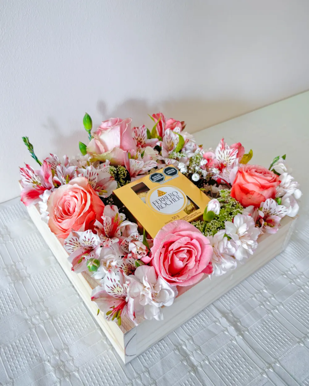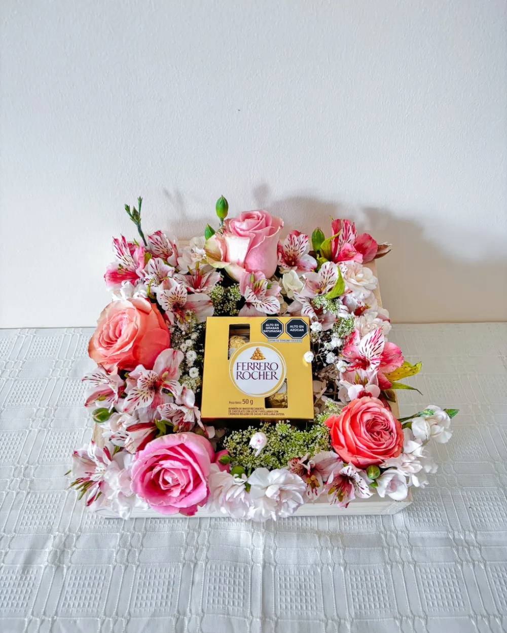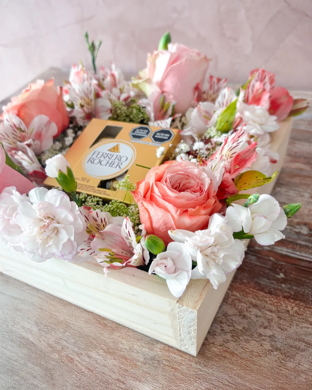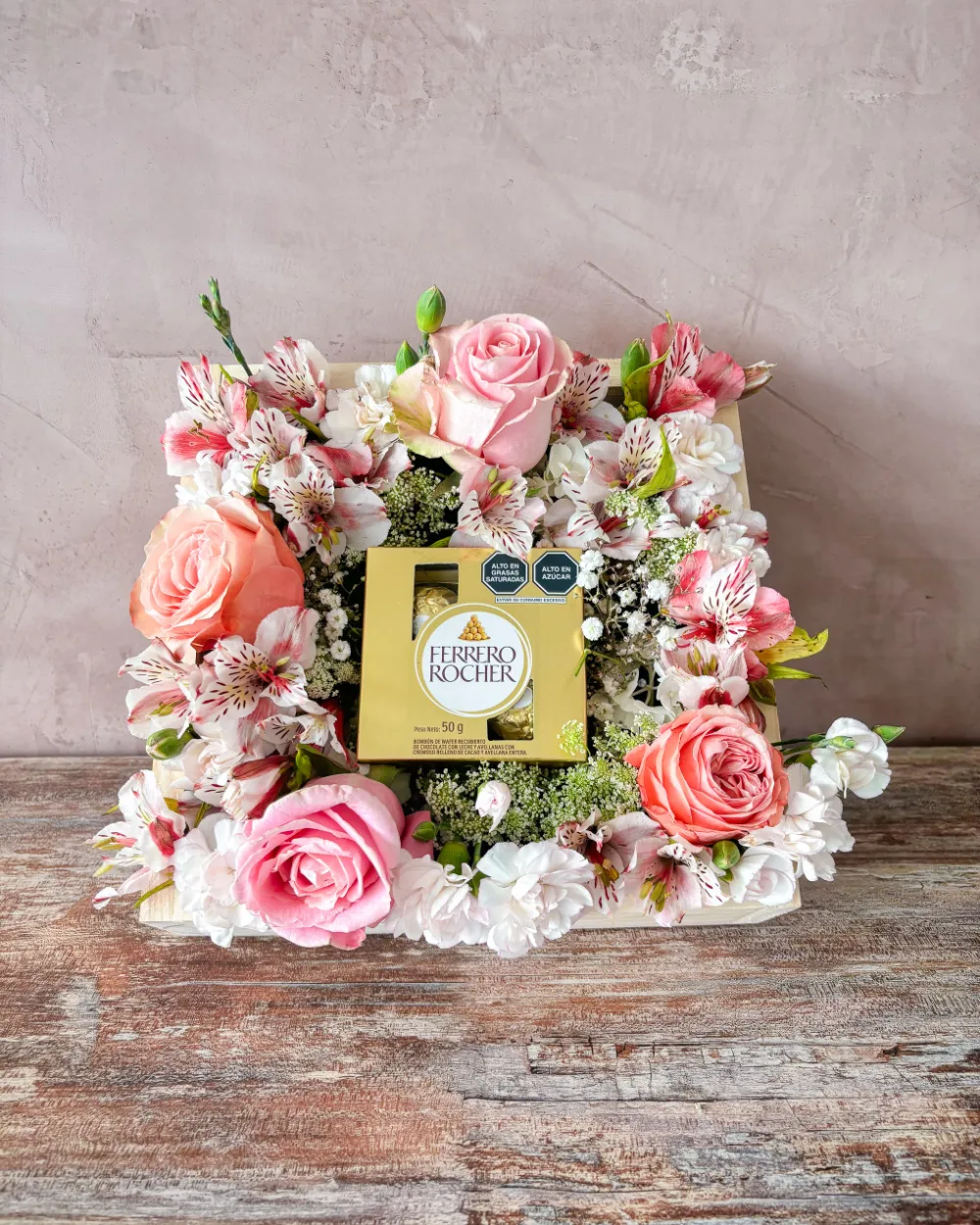 Contiene rosas rosadas, claveles, astromelias, flores variadas y es acompañado por caja de chocolate Ferrero Rocher 4 UND.
